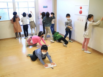 1-4の子どもたちは、オープンスペースの雑巾掛けをしていました。