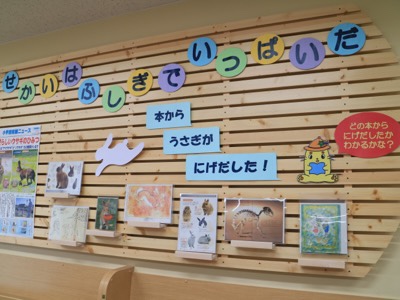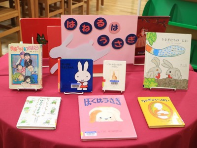 卯年なので、司書の古賀先生がウサギ関連の本を紹介コーナーに並べています。