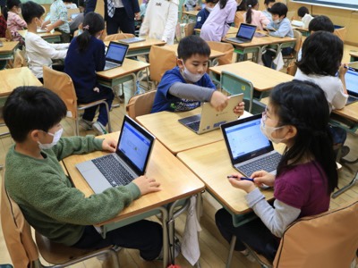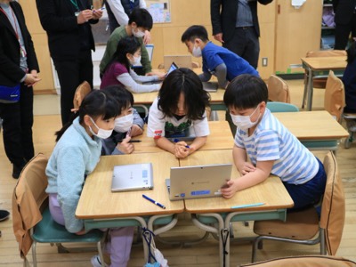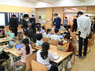 この授業は、タブレット活用の研修として他の学校の先生たちもたくさん見学に来ていました。