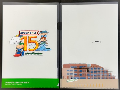 天沼小開校15周年を記念して、本日、子どもたちに記念品を配布しました。これは航空写真のクリアファイル(表/裏)です。