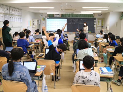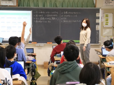 こちらは5-2の社会科の授業です。「情報」の学習で、携帯電話やスマートフォンが普及したことによるメリットとデメリットを考えていました。
