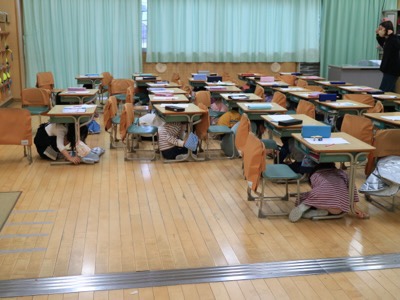 放送が流れると、子どもたちは頭を守るために机の下にもぐります。これは1-1です。