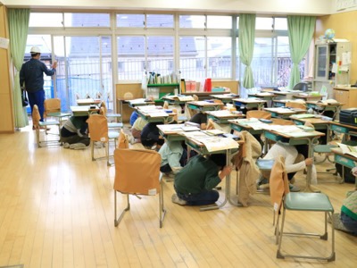 こちらは3-1です。大きな揺れがあっても机が倒れないよう、机の脚をしっかり握る「サルのポーズ」で余震が落ち着くのを待ちます。担任の先生は、ベランダの扉を開いて避難経路を確保しました。
