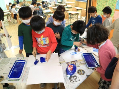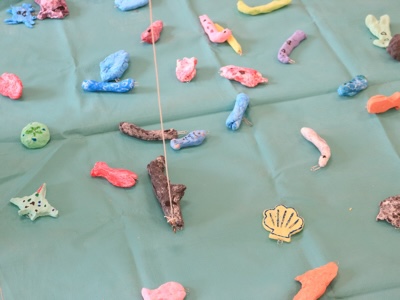 こだま学級が、図工の時間に紙粘土で作った魚で「つり大会」をしていました。