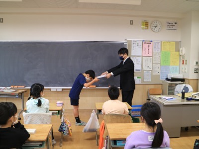 4-4の子どもが「防災作文コンクール」で最優秀賞を受賞したので、教室で賞状を渡しました。おめでとうございます。