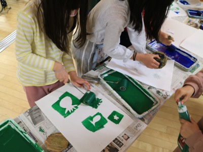 紙を切って貼ったものにローラーでインクを付け、紙を重ねて刷ります。