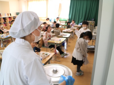 今日は、今学期最後の給食です。3-1の給食当番の様子です。