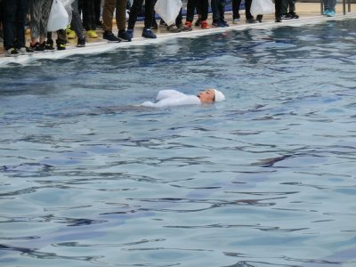 ペットボトルやビニール袋を使って、浮く体験等も行いました。子どもたちは、口々に着衣で浮くことや泳ぐことの難しさを伝え合っていました。
