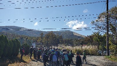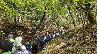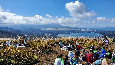 明神山の高さは約1,300m、山中湖の標高が約1,000mだそうなので、約300m登ることになります。互いに声を掛け合い登る子どもたちです。