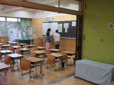 昨日の放課後、PTAの皆さんにもご協力いただき合同で学校施設の安全点検を行いました。写真は黒板が上下にしっかり動くか、確認しているところです。