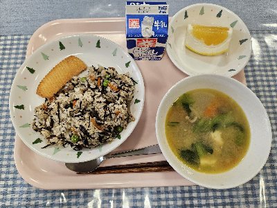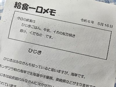 今日の給食メニューは、ひじきご飯・牛乳・イカの松笠焼き・豚汁・果物でした。天沼小では、栄養教諭がその日のメニューや食材に関するエピソードを一口メモとして伝えています。