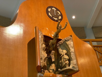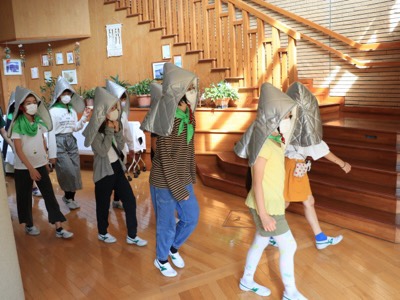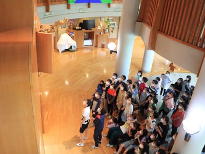 富士学園名物「猿時計」が17時に鳴るので子どもたちが集まって見ています。