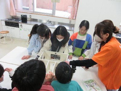 家の窓のどことどこを開けると、効果的に換気をすることができるのか?模型を使い学習しました。子どもたちは扇風機で風を送り、その流れを確認して実感しながら学んでいました。