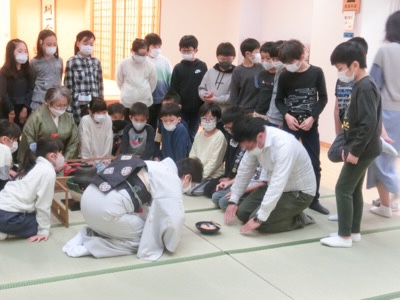 続いて、お点前の作法について、茶道の先生から担任の新宅先生が代表で指導を受けました。クラスの子どもたちに注目されて緊張気味の新宅先生です。