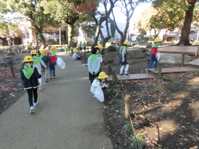 「グループで行動する」ということを学ぶ機会でもありました。きれいな色の葉っぱを、グループで一つの袋に集めます。