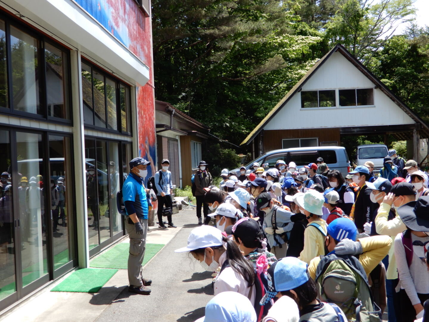 6月1日水曜日、天気に恵まれ第5学年の移動教室の1日目.先程、宿舎の富士学園に到着し、開園式を行いました。