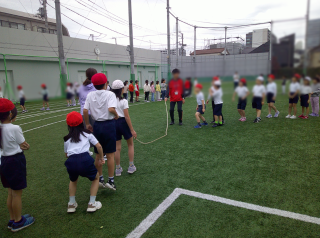 1年生は、回している縄になかなか飛び込むことができない児童が沢山いるので、縄を回さずに揺らして行う小波跳びから始めています。この1年生も後、数年経つと上級生のように素早く跳び越えることができるようになるのでしょう。