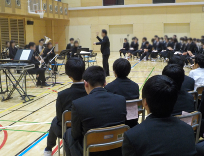 12月17日火曜日、大アリーナにおいて、昨年に引き続き、東京都教育委員会の芸術家派遣事業「笑顔と学びの体験活動プロジェクト」に選ばれ、中学部の全生徒が、松元宏康氏を指揮者とするブリッツフィルハーモニックウインズ(以下、「ブリッツフィル」)の演奏を生で聴くことができました。