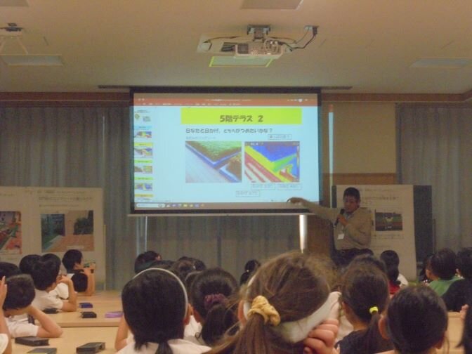 プランタの野菜の温度を測ると、葉っぱは冷たくて、実は温かい。人工芝と天然芝だと10度以上も温度差があるという結果も紹介されました。