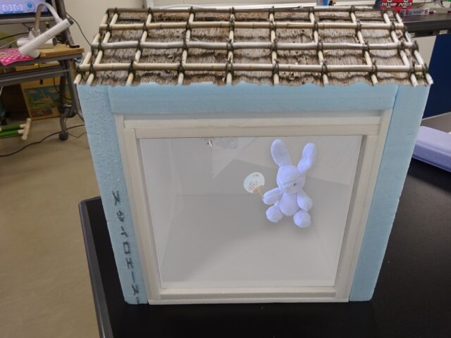家に見立てた実験箱に、太陽の代わりにライトを当てて、温度の変化を調べます。