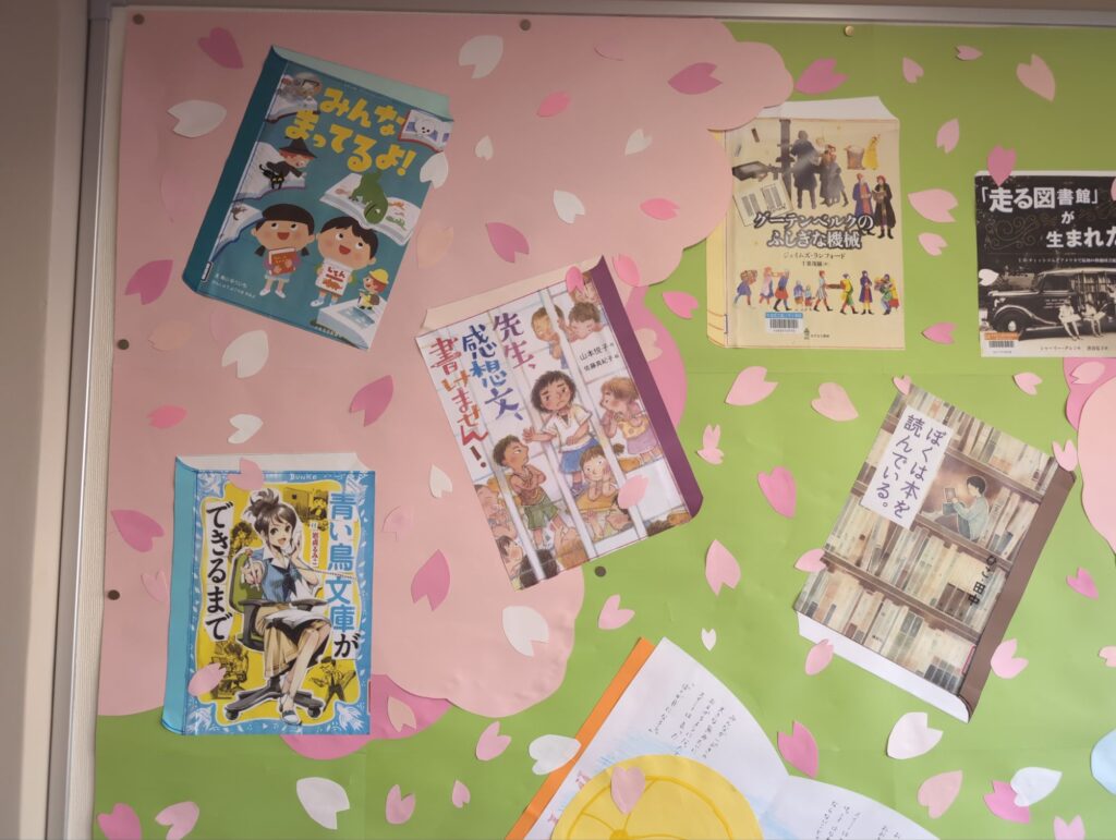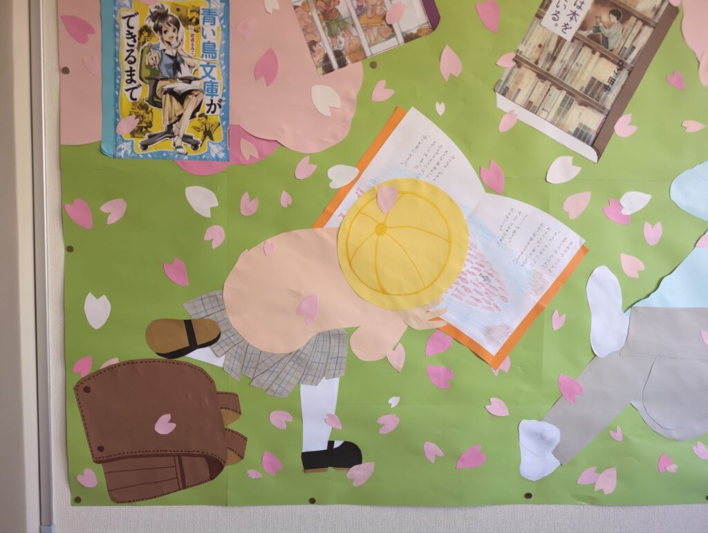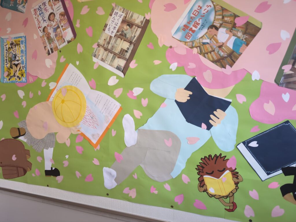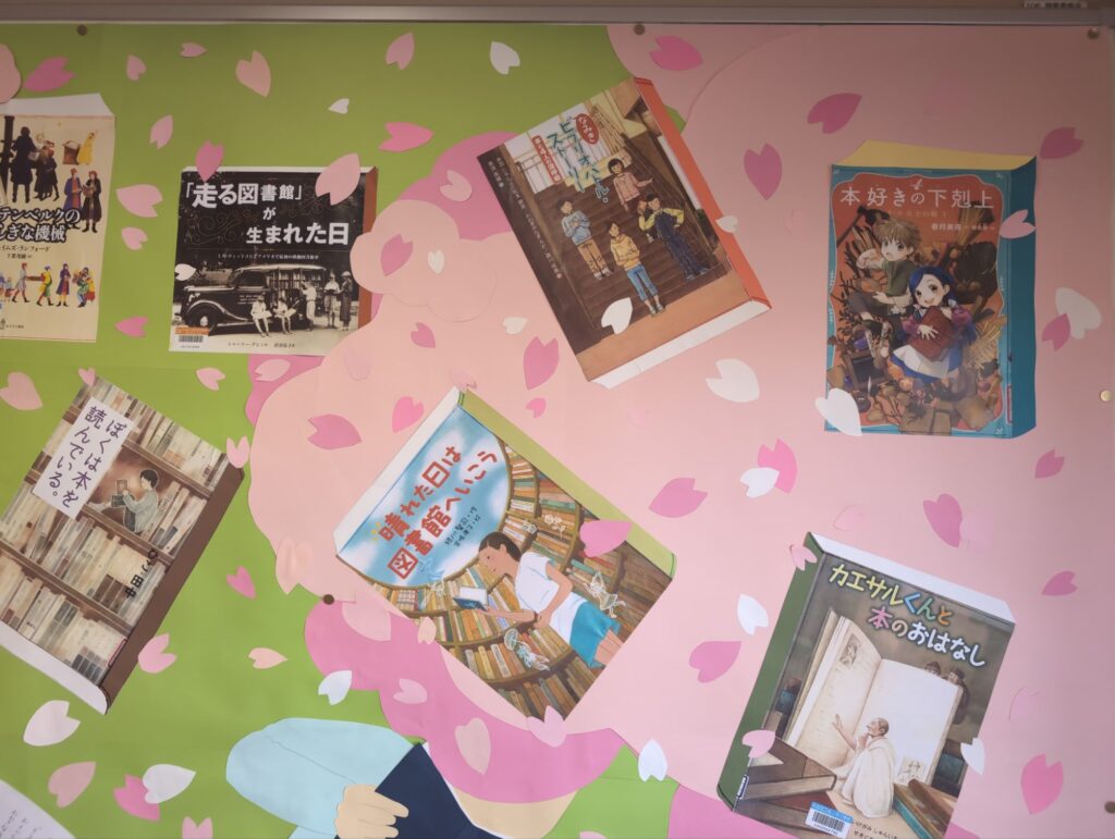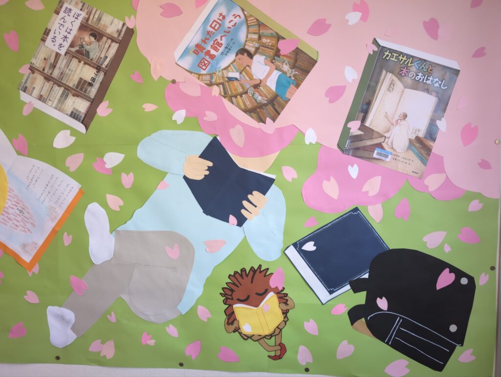 3・4月の本の紹介の壁絵のテーマは「本」です。