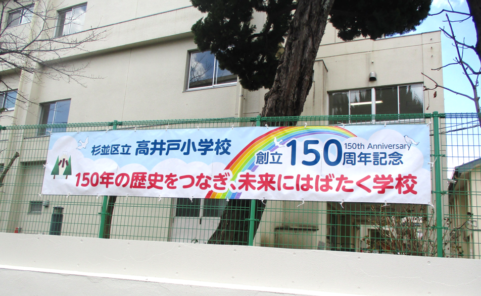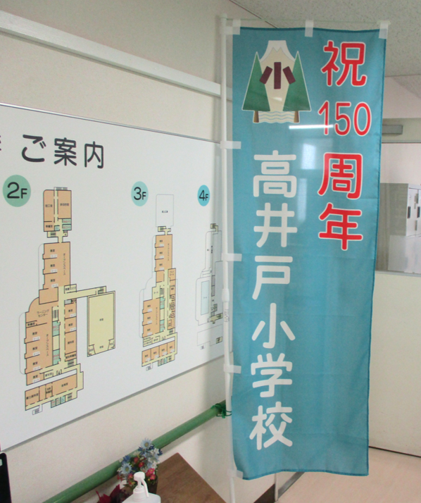 環状8号線側のフェンスに横断幕を、職員玄関内にのぼり旗を設置しました。歴史をつなぎ、未来へはばたいていくというメッセージを、子どもたちに伝えます。
