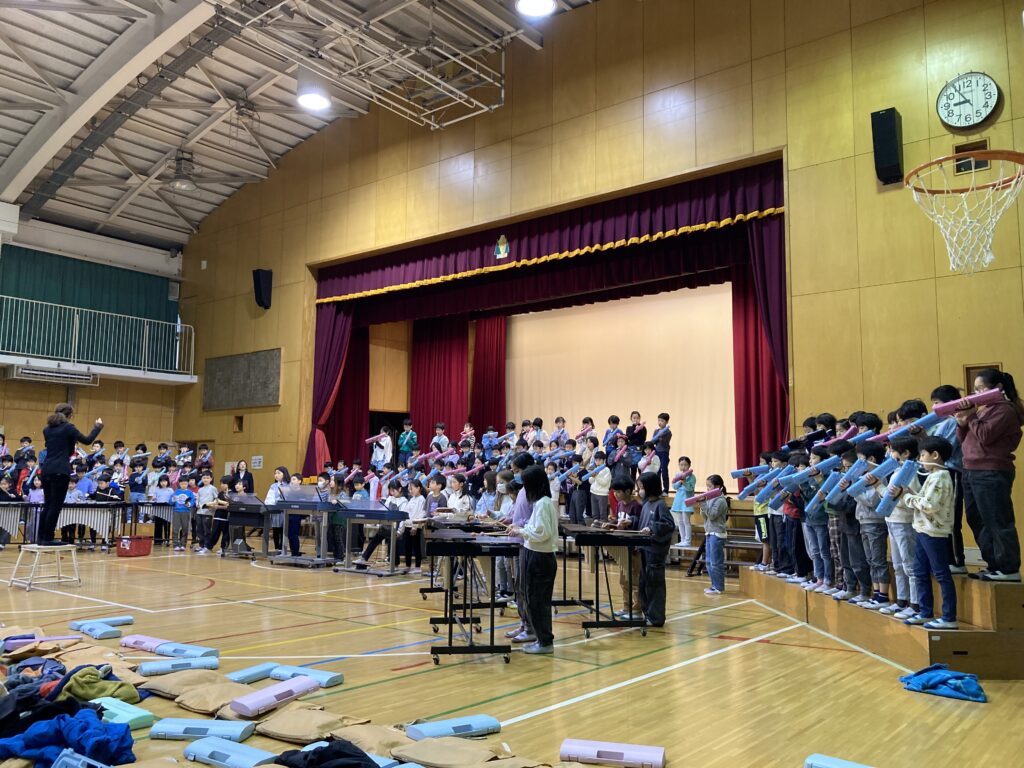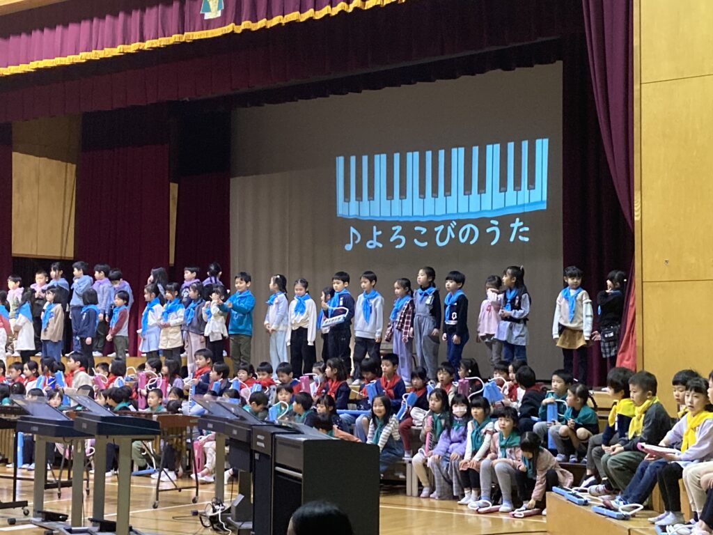 生活科「じぶんでできるよ」の学習などでチャレンジしてできるようになったことを発表します。最後に、できるようになった「よろこびを音楽でも表現しました。
