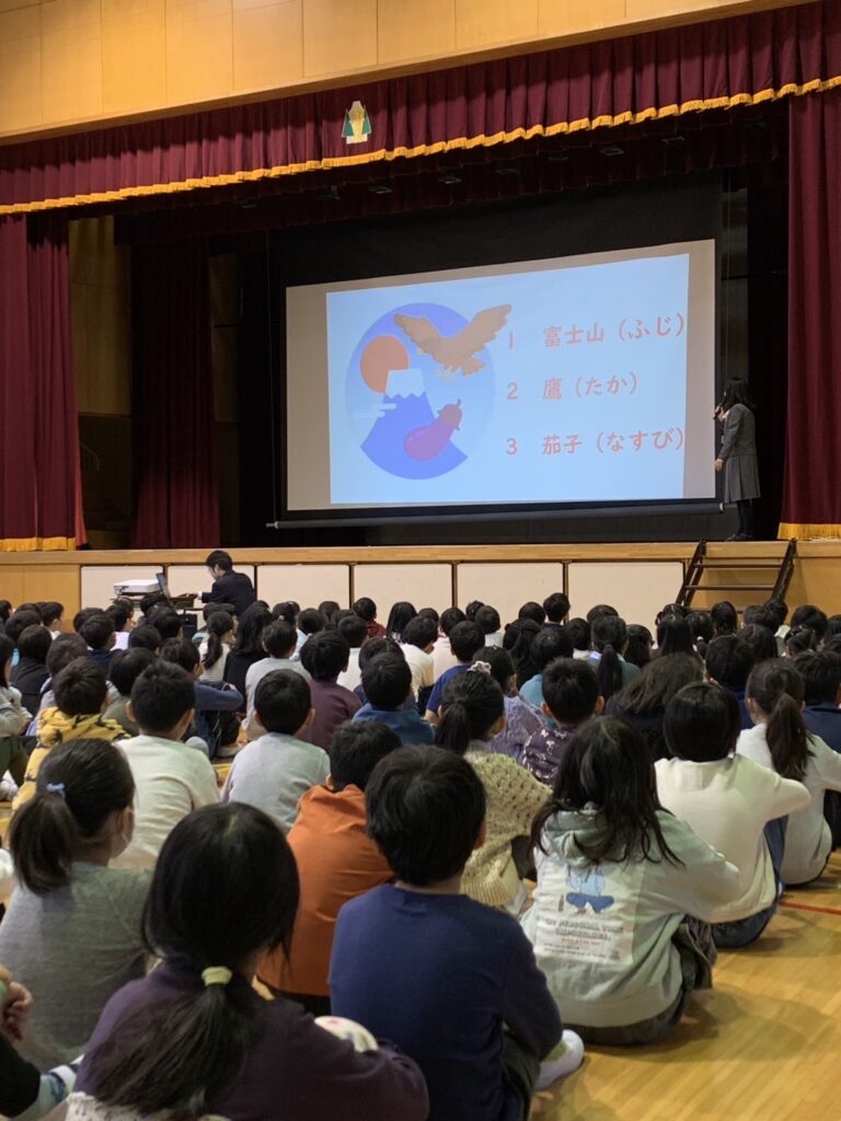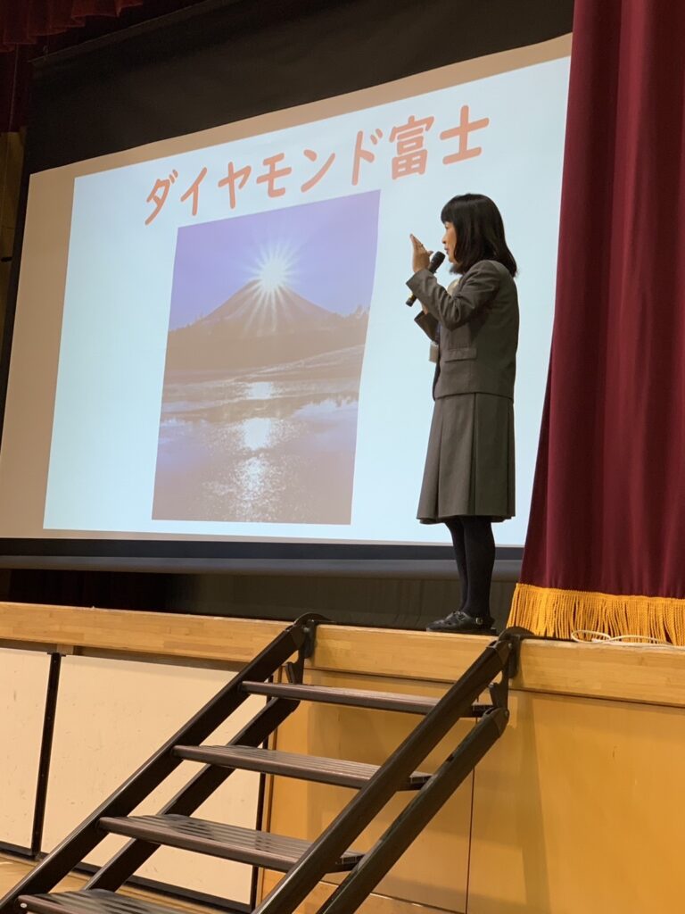 令和7年がスタートしました。本年もよろしくお願いいたします。高井戸小では、1月8日に3学期の始業式を行いました。校長からは、元旦に見ると縁起のよい初夢の話をしました。その中で1番の富士山と初日の出が重なり、ダイヤモンド富士になった今年の映像を披露しました。子どもたちが自分の夢や希望に向かいダイヤモンド富士のように輝いてほしいと伝えました。