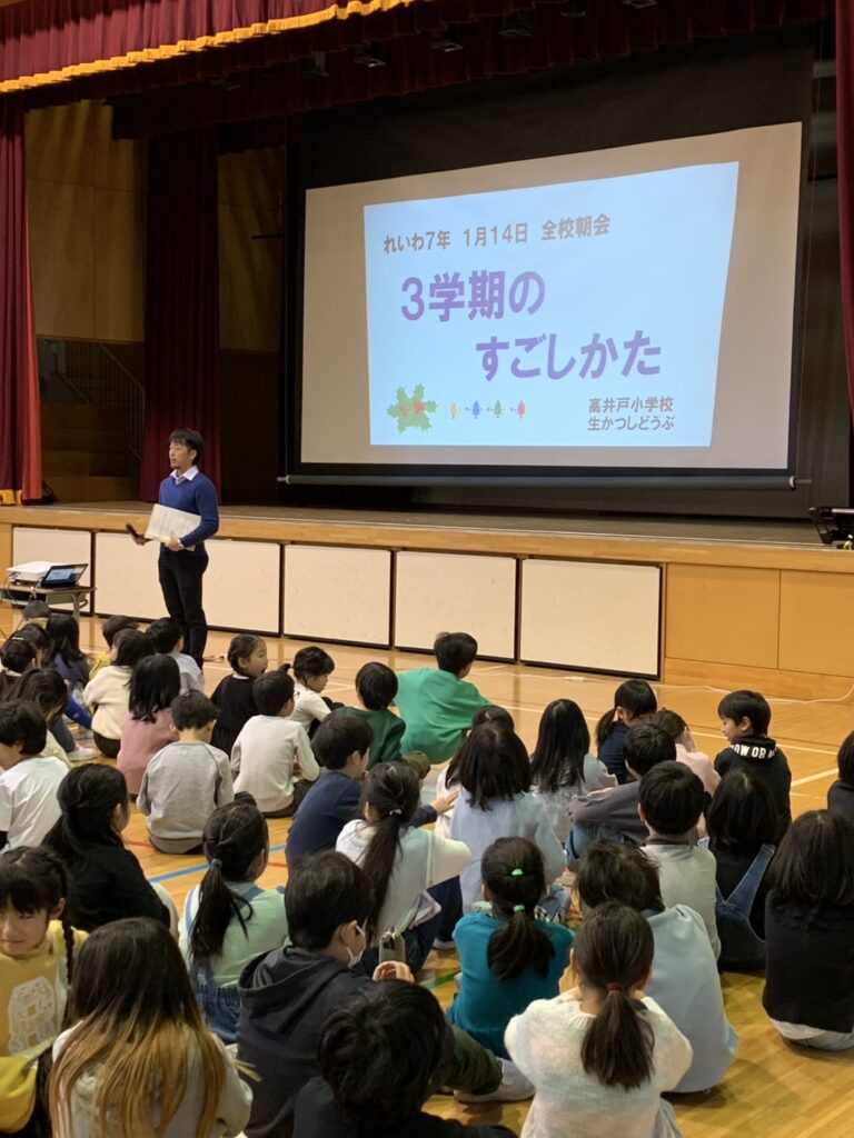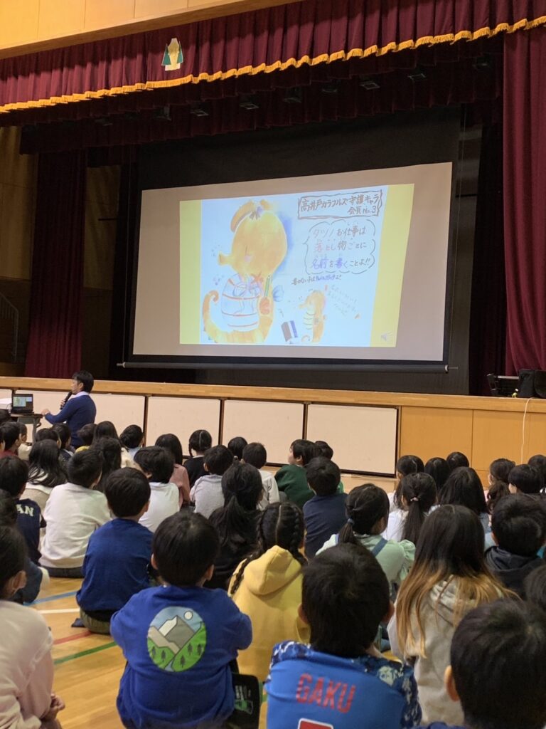 くるのうこの日の全校朝会では、「3学期のすごしかた」ついて生活指導の先生からお話がありました。特に持ち物に名前を書き、無くしたり忘れたりしたときに戻って来るように話がありました。「タツノおとしご」になぞらえ「タツノおしごと」キャラが登場しました。落とし物や忘れ物が減るようにしたいですね。