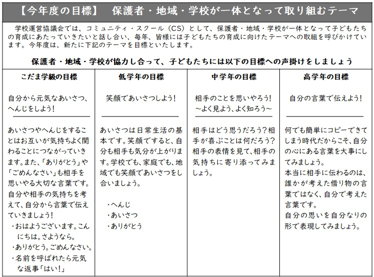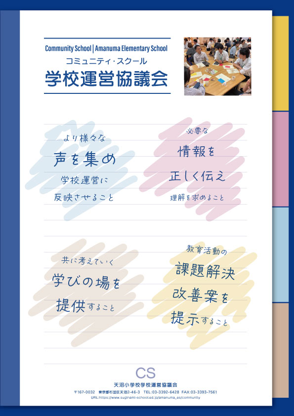 協議会の日々の活動や「学校評価(みんなの天小アンケート)」「サマーワークショップ(みんなで熟議)」などをはじめとする具体的な取り組みについては「あまぬまだより」をはじめ、様々な形でみなさまにご紹介していきます。