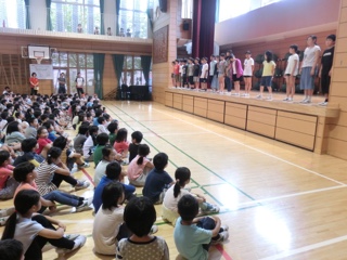 「気をつけ」の指示です。低学年の子供たちもいい姿勢をしています。