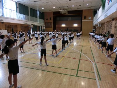 先日2年生が案内の練習をした「学校たんけん」。今日は実際に1年生を連れて校内を歩きます。出発前にアリーナで注意を聞きました。