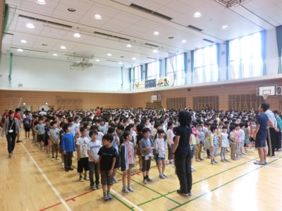 アリーナで児童集会が始まります。今日は集会委員会企画のゲーム集会なので、班の番号を掲げて、たてわり班ごとに集合します。