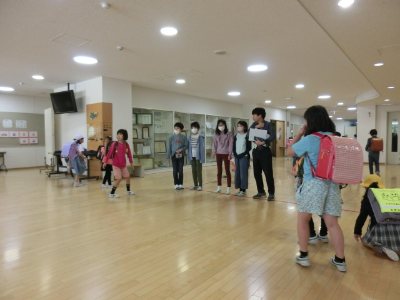 今日は「人間まちがいさがしゲーム集会」。集会委員会が寸劇を2回繰り返し、どこが違っていたかを当てるクイズです。持っている物が違っていたり、登場する人の順番が違っていたりするのを見つけなくてはいけません。