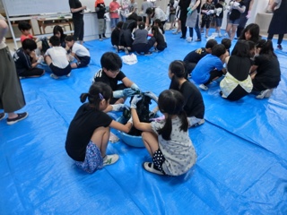 家庭科室では5年生が藍染体験をしていました。伝統の藍染Tシャツを作ります。絞り染...