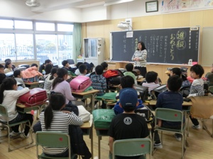 こちらは4-2。黒板には「進級おめでとう」という、新しい学年に向けた担任からのメッセージが書かれています。