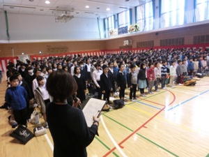 新しい1年が始まりました。子どもたちはクラス分けの一覧をもらい、新しいクラスでアリーナに整列しました。