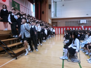 6年生の「歓迎の言葉」です。天沼小の良いところを「U.S.A.」のリズムに合わせて踊りながら伝えました。新1年生はあっけに取られて見ていました。