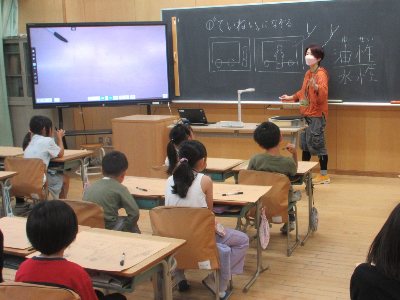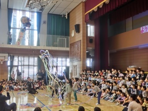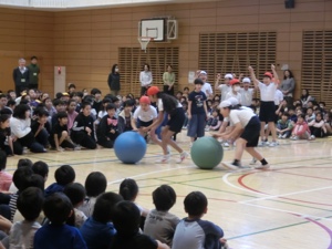 5年生は天沼小の1年間を紹介しました。運動会で大玉送りをしているところだそうです。