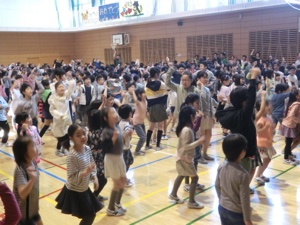 これは「みんなで楽しもう」というコーナーで、全員で「猛獣狩りに行こうゲーム」をしているところです。グループに必ず1年生を入れなければいけないルールなので、1年生を奪い合っていました。
