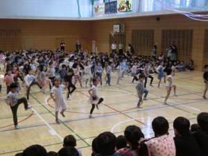 今朝はアリーナで「1年生を迎える会」が開かれました。1年生が天沼小学校の子どもたちの仲間入りをするのをお祝いするイベントです。