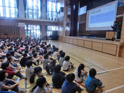 長い連休が明け、子どもたちが学校に戻ってきました。今日は火曜日ですが、週のはじめなので全校朝会があり、アリーナに整列しました。