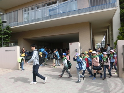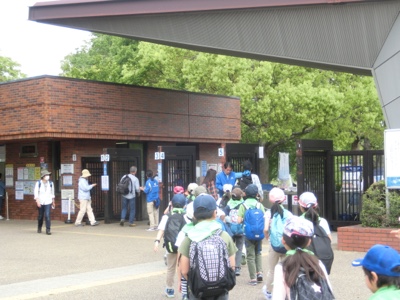 今日は3年生が遠足で昭和記念公園に出かけます。いつものようにお世話になるAWのみなさんに挨拶をしました。