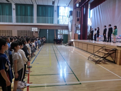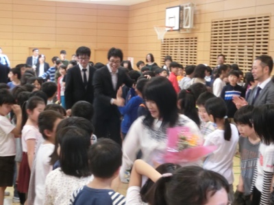 アリーナに並んだ子どもたちの列を縫って、先生方が退場していきました。子どもたちはこれまでお世話になった感謝と寂しさの混じった表情で見送っていました。