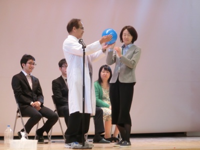 途中から白衣に着替えて、松川先生が最後の実験を見せてくれました。「風船に針を刺しても割れないんですよ。びっくりでしょ?」という実験のはずが…