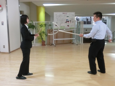 警察の方にさすまたでの防御のしかたを教わりました。実際にこんな状況が起きるのは困りますが、そういう時のためにこうした訓練も必要です。
