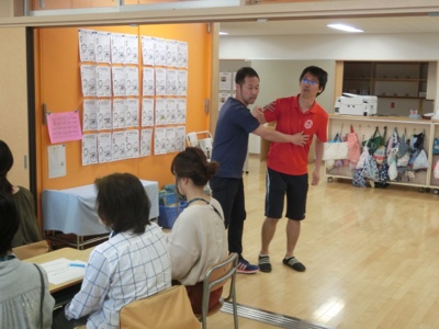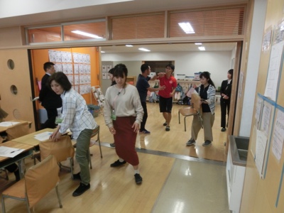 児童の下校後、教職員が不審者対応訓練を行いました。荻窪警察署の警察官の方から指導を受けます。