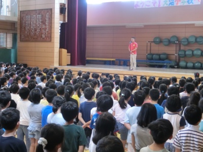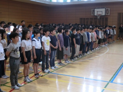 朝会前、アリーナに整列する子どもたちです。朝会は、まず校長の話から始まります。今日は、「移動教室とは何か」という話をしました。