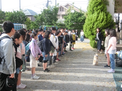 校庭で出発式です。この移動教室のスローガンは「実行 充実 一生の思い出」です。