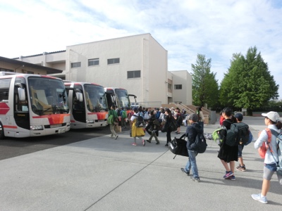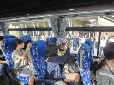 予定通りの7:00ちょうどに出発しました。お見送りのお家の方々や先生たちに手を振って出かけます。3日間充実した移動教室になるといいですね。